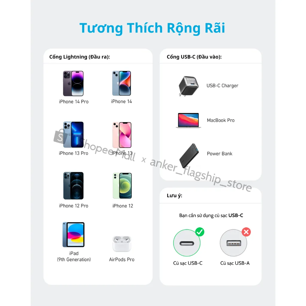 • Cáp sạc PowerLine III Flow là cáp sạc chuẩn CtoL (1 đầu TypeC, 1 đầu Light–ning) nên cáp chỉ có thể sử dụng với củ sạc có chuẩn sạc là USB-C (TypeC) sử dụng công nghệ sạc là Power Delivery (PD), quý khách vui lòng lưu ý rõ tránh trường hợp mua nhầm với cáp Light–ning USB thông thường (đầu USB chữ nhật vuông cạnh).
